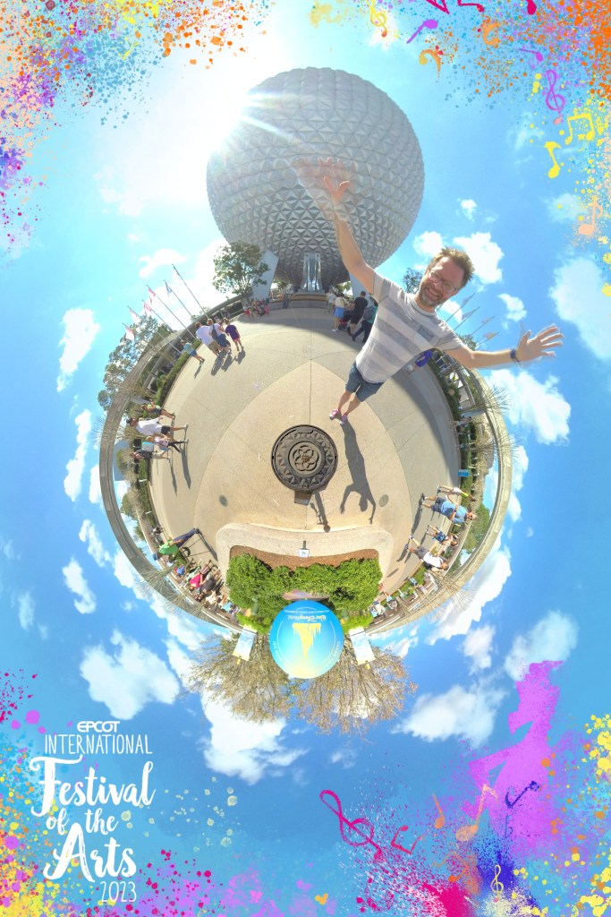 Bei TinyPlanet wird mit einer 360Grad-Kamera ein Bild aufgenommen. Oben bei dem Beispiel des PhotoPass-Fotografen könnt ihr die 360Grad-Kamera vor ihm stehen sehen. Das, was wie ein Roboter anmutet. Das Ergebnis schaut dann so aus: