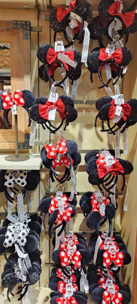 In der Regel klassisch Schwarz. Als Minnie-Ohren dann noch mit roter Schleife. Teilweise mit weissen Punkten auf der Schleife.