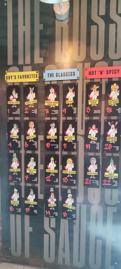 Ich war zu Mittag bei Chicken Guy! … Sehr lecker. Vor allem die Saucen sind hier ein echtes Highlight. Ich hatte 4 aus 22: