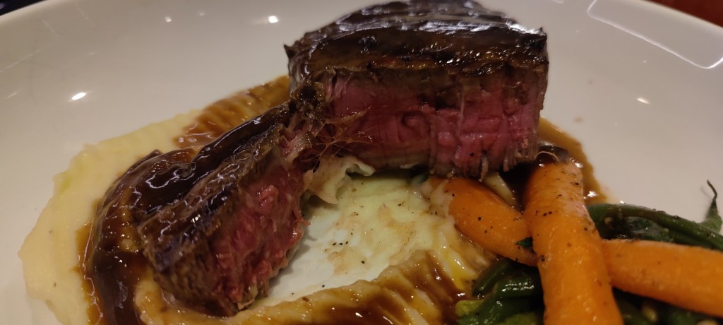 Ich habe mich für die Hummersuppe als Starter, das Filet Mignon als Hauptspeise und das Pistazienmus als Dessert entschieden. Vor- und Hauptgericht waren extrem lecker. Das Filet ist auf der Zunge zergangen. Der Nachtisch war leider nur „in Ordnung“. Da hätte ich mehr erwartet.