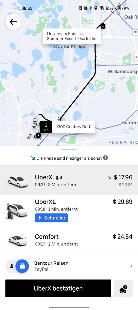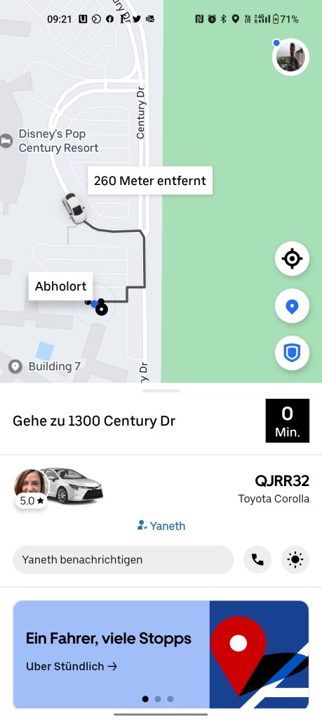 Also nutze ich dieses Mal Disneys und Universals eigene Shuttles und für alles ausserhalb deren Parks: Rideshare. Die längste Strecke, die ich mit Uber/Lyft bisher hatte war die jetzt von Disney zu Universal: