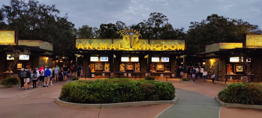Ankunft ist knapp 20 Minuten später. Für Disney-Hotelgäste öffnen alle Parks immer eine halbe Stunde früher. Animal Kingdom heute um 7:30 (für alle anderen Gäste dann erst um 8:00 Uhr). Der Bus-Service beginnt ca. 45 Minuten vor Parköffnung. Die Fahrt um 6:45 Uhr war somit die erste (und allein vom Pop Century Hotel waren das insgesamt 3-4 Busse…).Man darf auch nicht vergessen, dass Disney in Orlando über 25(!) eigene Hotels hat. Ich bin also am Eingang nicht unbedingt der erste, geschweige denn der einzige 😅